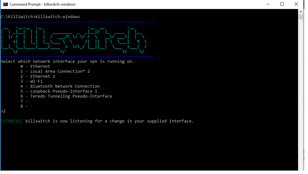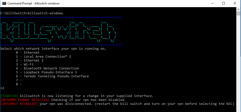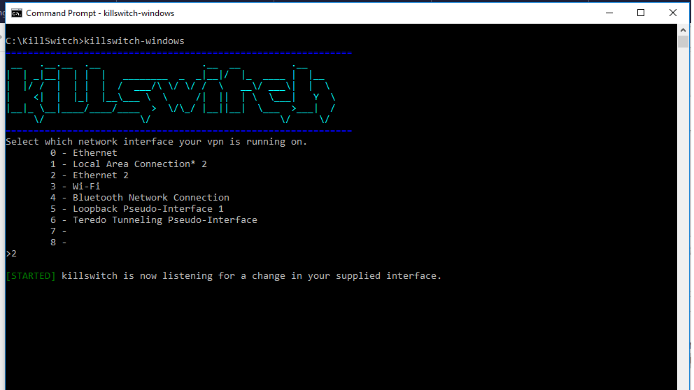 Once your vpn is connect, and you have selected the proper interface, KillSwitch will begin listening for a change of connection on that interface, and once it does, it will quickly check if your vpn is down, and if it is, KillSwitch will use ipconfig to disable outgoing traffic to stop yourself from leaking your IP.