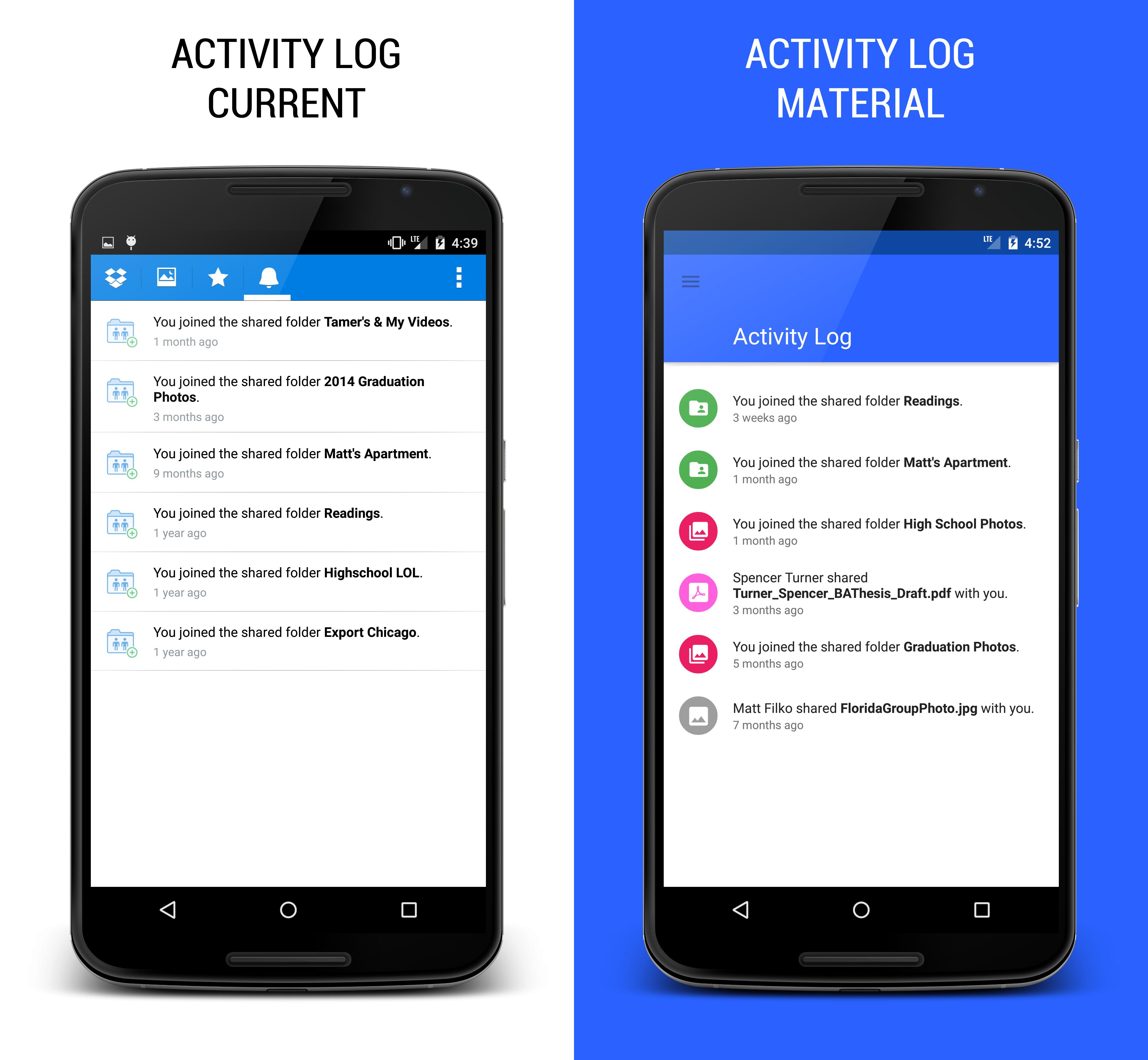 I acknowledge some inconsistencies in these mockups (having lists vs grids or having an extended action bar only on the Activity Log screen) but this is just an experimental redesign toying around with different possibilities afforded by Google's new Material Design. Hope you enjoyed it!