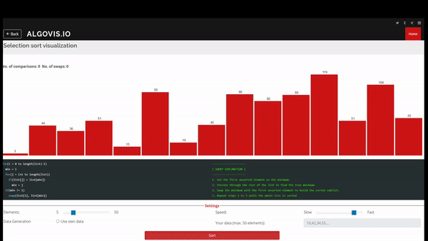 AlgoVis.io is an online algorithm visualization tool written using HTML, CSS, JS, jQuery and d3.js.