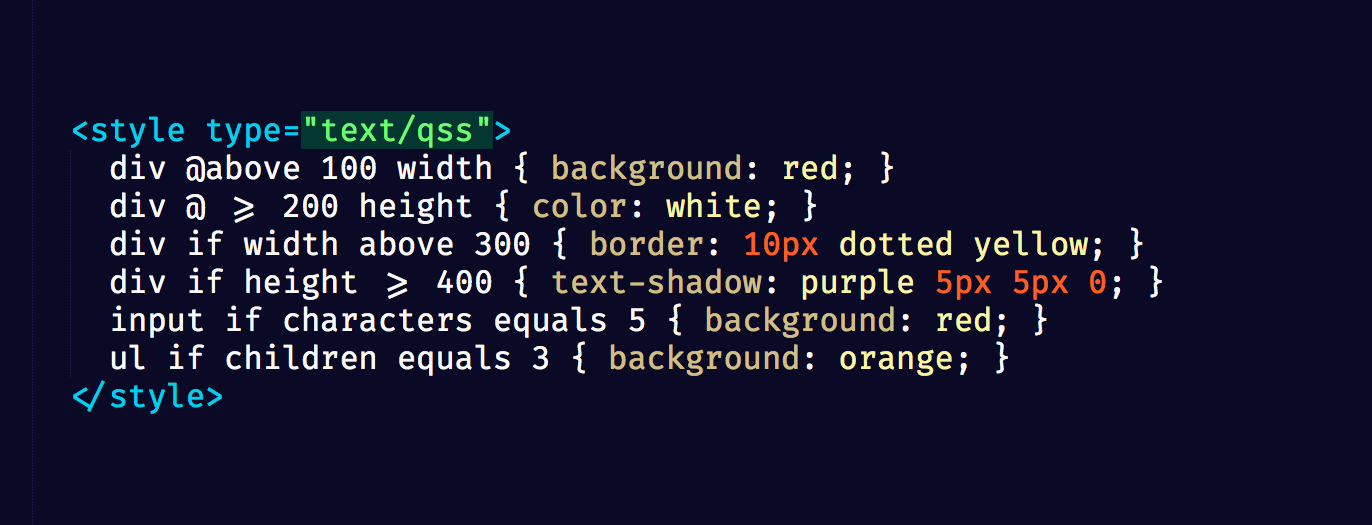 The goal of QSS is to define a simple syntax for specifying element queries by adding a new ending part between a CSS selector list and the block of rules that help define the breakpoints when those rules are to apply.