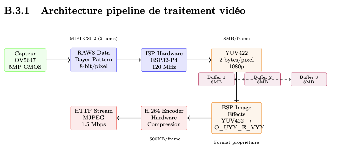 - Pipeline vidéo : ISP Hardware → YUV422 → H.264 (compression matérielle)