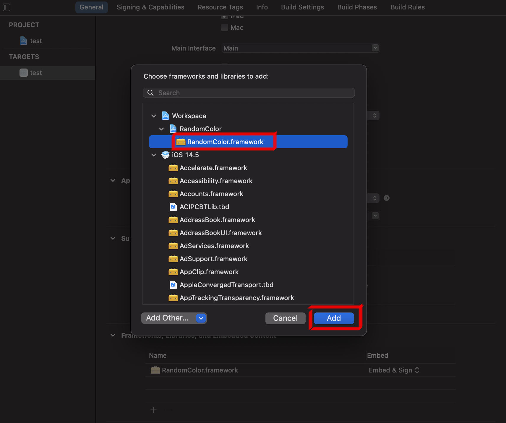 - 아래 사진과 같이 RandomColor Framework를 선택하고 추가