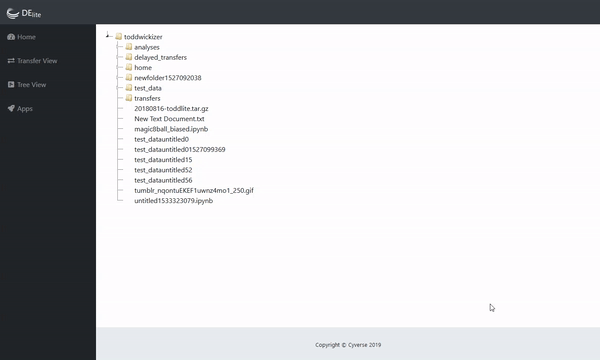 Cyverse DElite is a demonstration of Django combined with the Discovery Environment. It is a useful resource to anyone looking to use the Discovery Environment API in their own django/python project. The backend is coded in Python/Django, the front-end is coded in modern javascript. The aim of this project is to mock elements of the real Discovery Environment, hence the name, DElite.