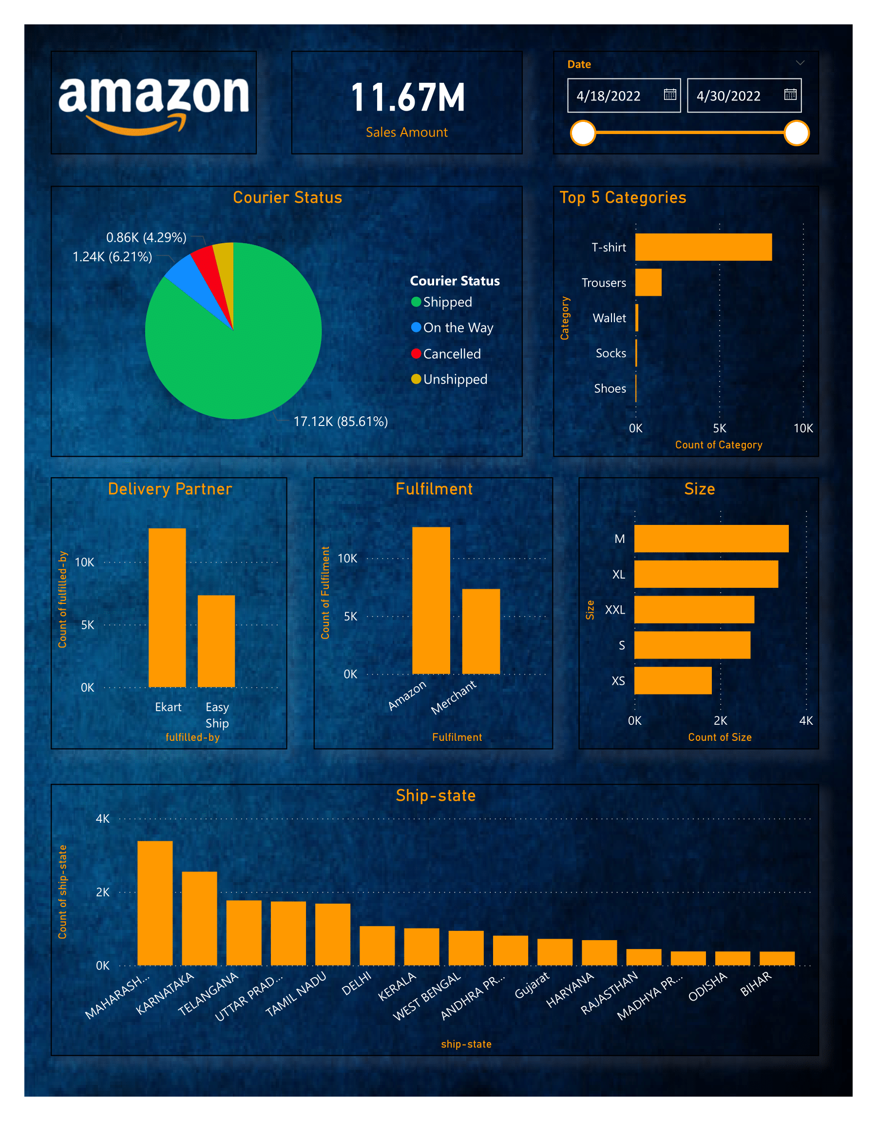 Data Analytics Excel Power Bi SQL Python Projects - Amazon-Sales-Report Clean a Data Data visualization Crete a Dashboard Using Power Bi Dashboard Preview The screenshot above shows the main visualizations in the Power BI dashboard.