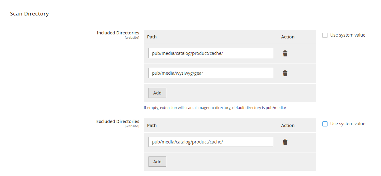 pub/media/catalog/product,pub/media/customer. - If left blank, the system will scan the default directory of