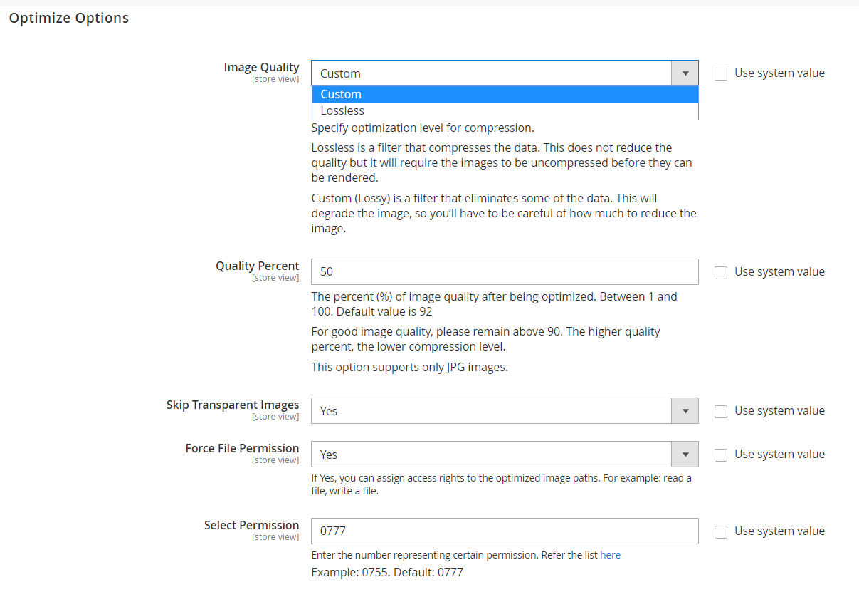On the other hand, Custom compression, also known as Lossy, will help you to reduce the file size dramatically. However, there will be a loss in the data of the original image file; in other words, the quality of the image will be affected. When the Image Optimizer extension is applied to your store, the retained proportion of quality after the compression process can be set without a visible loss in image quality. As a result, you can retain full control of image quality as well as the compression level.