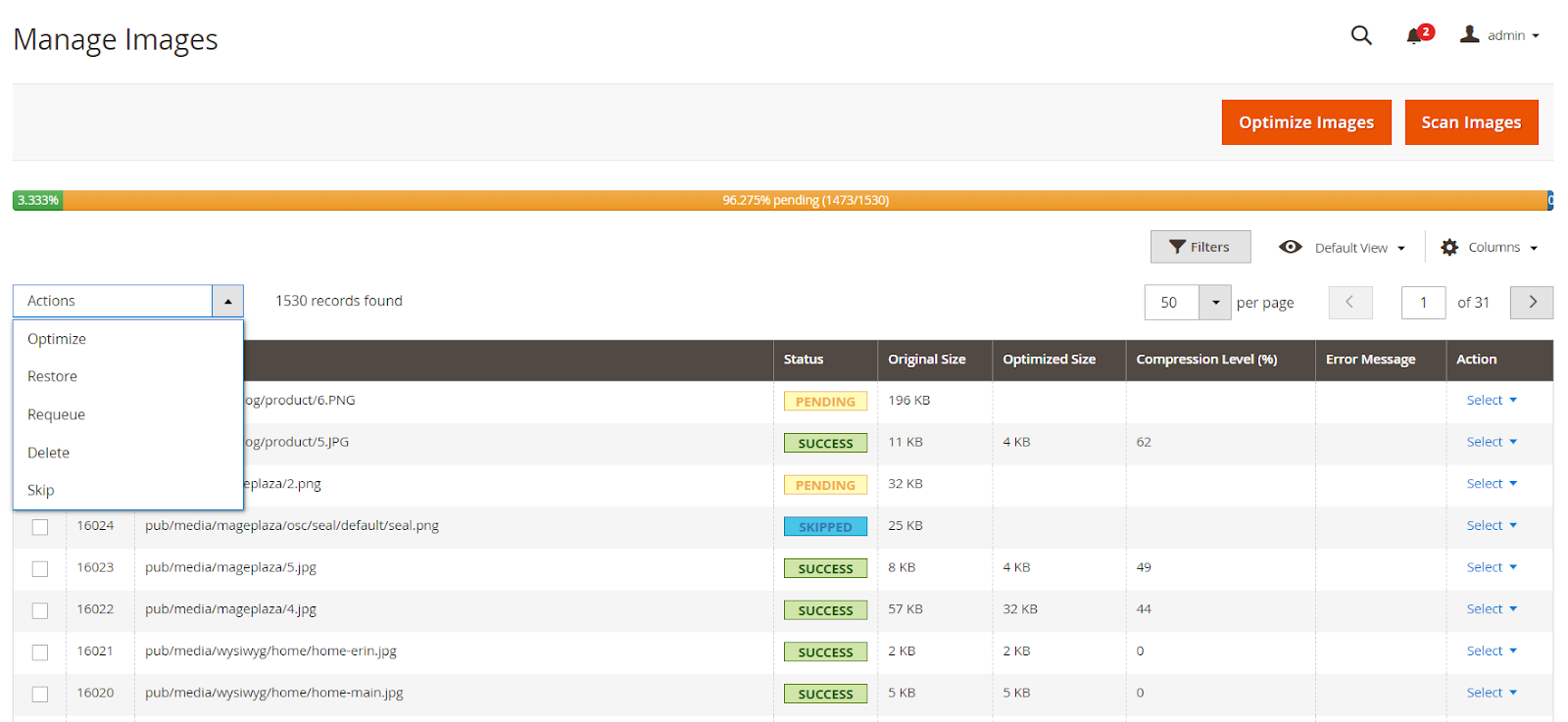 Stores > Image Optimizer > Manage Images - Here recorded and statistics scanned image information and Optimize or not include information of the fields: Path, Status, Original Size, Optimized Size, Compression Level (%), Error Message , ....