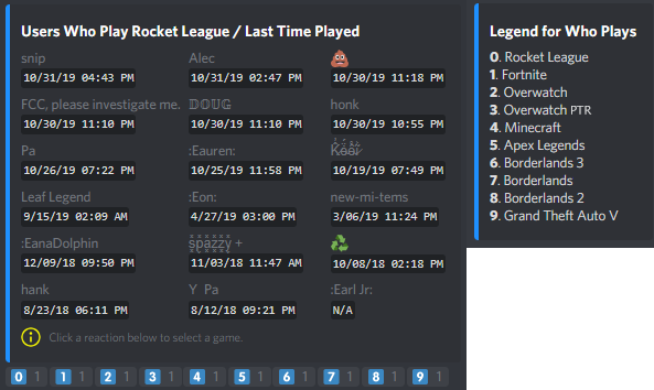 Game Name> -to get list of players and last time played for Game Name. - .lets-play -