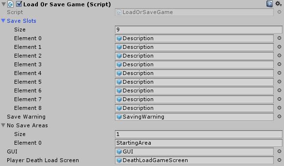 | Save Slots | Gameobject List | List of gameobjects to manipulate/populate with information regarding previous saves. |