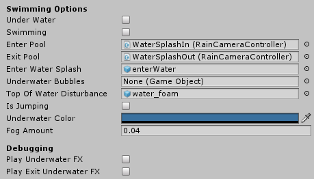 | Play Underwater FX | bool | Debugging. Play the bubbles effect |