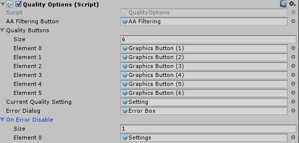 | Quality Buttons | GameObject List | List of buttons to display the graphic options. |