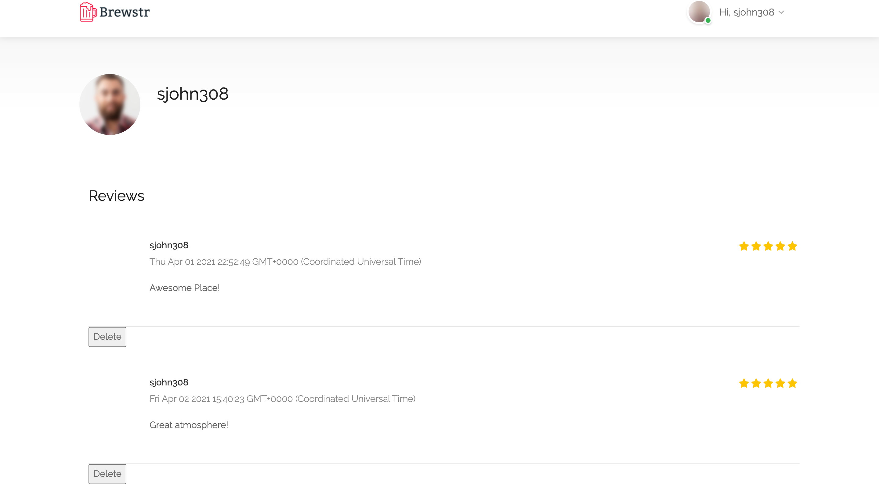 - Profile page that shows all your reviews and ability to delete them