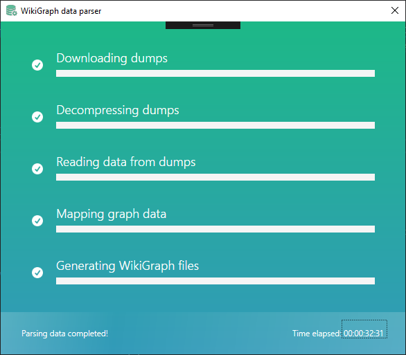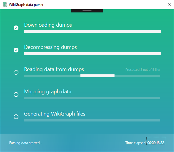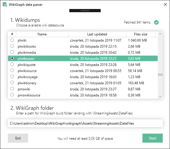 ReleaseWikiGraph Parser. Po uruchomieniu aplikacji poczekaj, aż załaduje ona wszystkie dostępne wikipedie. Wybierz interesującą Cię paczkę danych oraz podaj ścieżkę do pobranego\wikigraph\Assets\StreamingAssets\DataFilesi naciśnij przyciskStart. UWAGA: Pliki o rozmiarach przekraczających 1GB wymagają znacznej ilości pamięci RAM na komputerze.