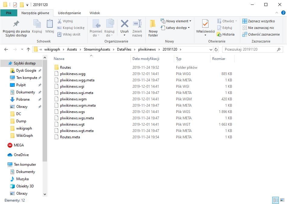 - Wygenerowane pliki znajdują się we wskazanym katalogu z którego aplikacja WikiGraph będzie odczytywała dane. W przypadku wielokrotnego pobierania tych samych danych, rozróżniane są one na podstawie daty w nazwie folderu. WikiGraph używa najnowszej paczki z danymi.