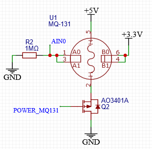 MQ-131 Wiring, POWER_MQ131 is connected to a output pin, AIN 0 is connected to the ADS1115