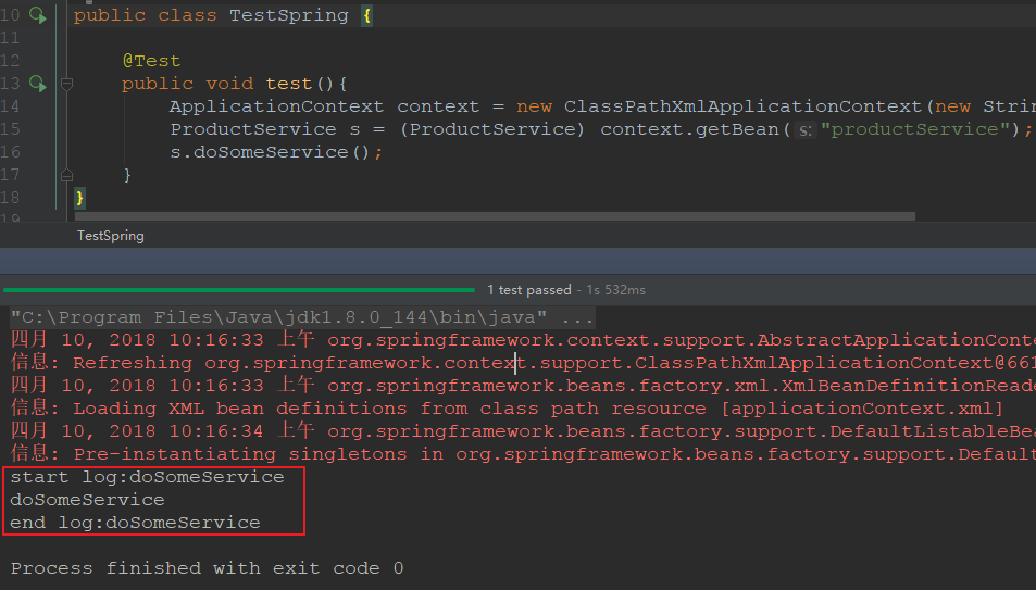 </beans>- 再次运行 TestSpring 中的测试代码,代码并没有改变,但是在业务方法运行之前和运行之后,都分别输出了日志信息: