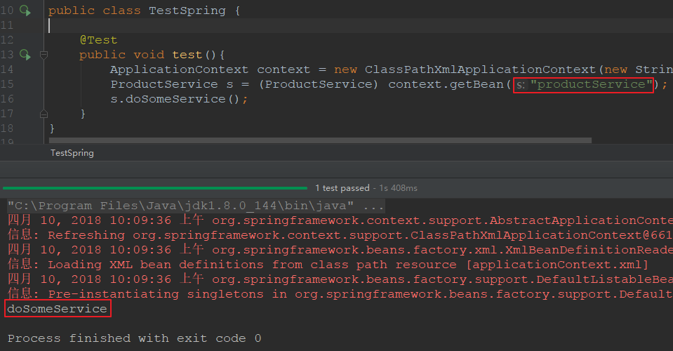 <bean name="productService" class="service.ProductService" />- 在【TestSpring】中编写测试代码,运行: