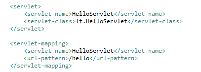<?xml version="1.0" encoding="UTF-8"?> <web-app xmlns="http://xmlns.jcp.org/xml/ns/javaee" xmlns:xsi="http://www.w3.org/2001/XMLSchema-instance" xsi:schemaLocation="http://xmlns.jcp.org/xml/ns/javaee http://xmlns.jcp.org/xml/ns/javaee/web-app_3_1.xsd" version="3.1"> <servlet> <servlet-name>HelloServlet</servlet-name> <servlet-class>lt.HelloServlet</servlet-class> </servlet> <servlet-mapping> <servlet-name>HelloServlet</servlet-name> <url-pattern>/hello</url-pattern> </servlet-mapping> </web-app>web.xml 提供路径和servlet映射关系,这意思是把/hello这个路径,映射到 HelloServlet 这个类上,需要注意的是:< servlet> 标签下的 < servlet-name>与 < servlet-mapping> 标签下的 < servlet-name> 必须一样(因为标签被编辑器识别故<后加了一个空格)