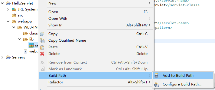 - 为该项目增加Servlet的支持. 1.1. 把Tomcat根/lib中servlet-api.jar文件拷贝到项目下WEB-INF下的lib中 1.2. 在项目中选择servlet-api.jar,鼠标右键,build path-->add to build path