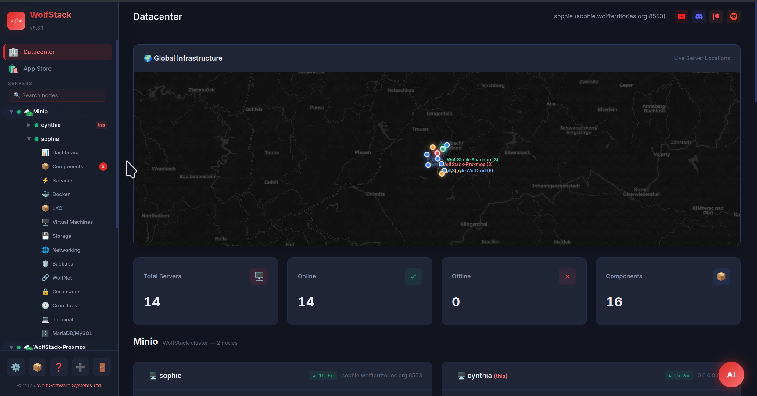 The flagship management dashboard from Wolf Software Systems. Monitor servers, manage virtual machines, Docker and LXC containers, control services, and manage your entire infrastructure from one beautiful web interface.