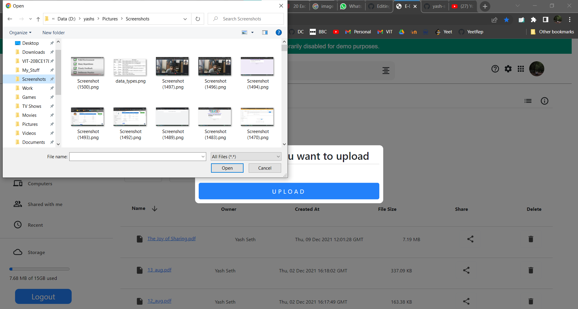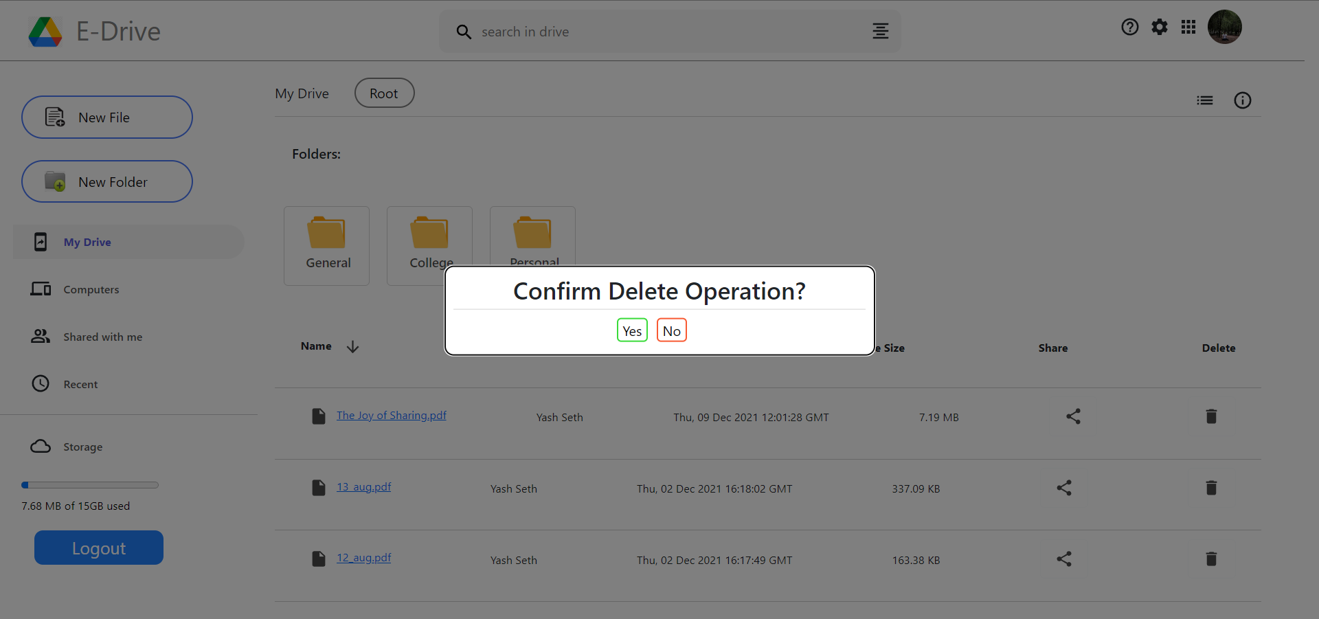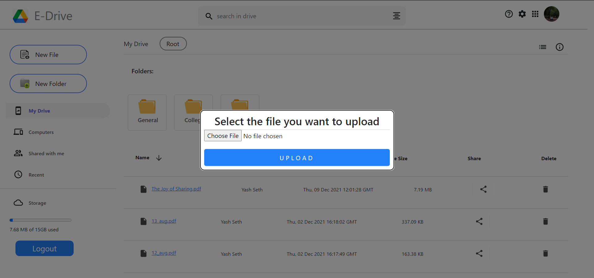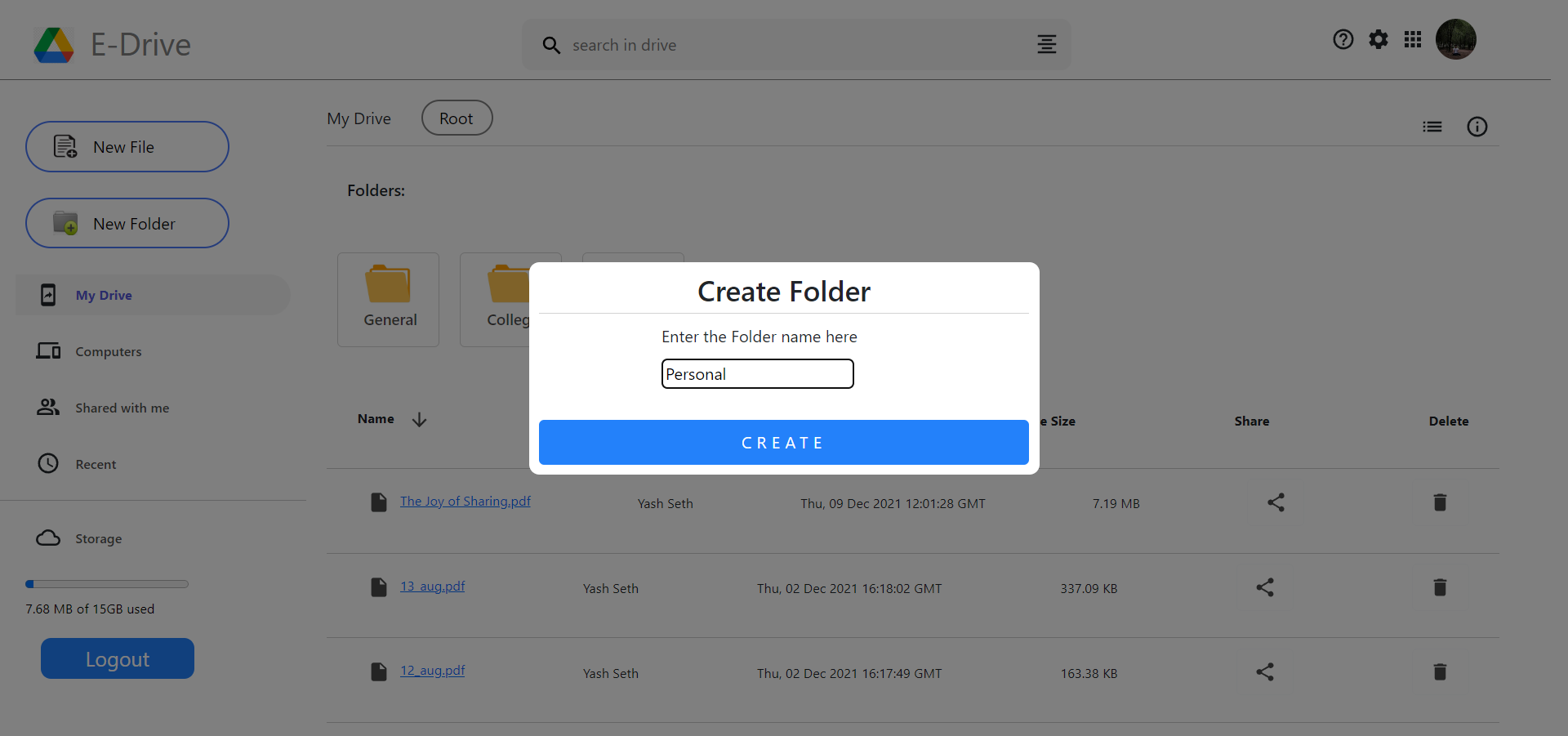 A Cloud-Based Storage Service, with a functional front-end and back-end. Developed using React framework for the front-end and Firebase and Node.js as the backend. Functionalities include authentication, file upload/download/sharing, global search within a user’s view, easy navigation among others.