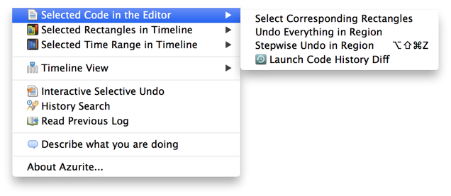 This command searches through the history for all the edit operations performed on the currently selected region of code. The resulting rectangles are highlighted on the Timeline view.