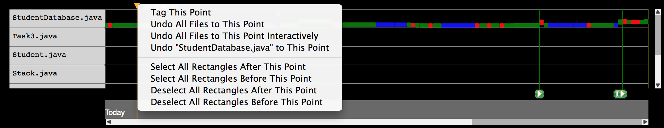 Instead of simply undoing all files to this point, this command selects all the rectangles on the right side of the marker position, and then launches the Interactive Selective Undo dialog. This is useful when you want to backtrack to a certain point in time in the history while keeping some code changes.