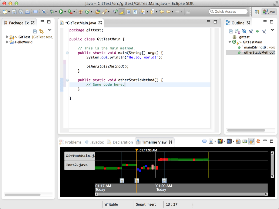 You can also filter the files so that you can focus on the history of certain files. You can show a single file and hide all others, or show all the files that belong to the same Eclipse project by right-clicking the file name in the Timeline view.