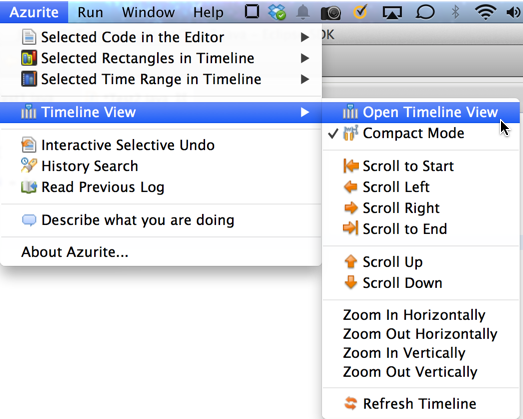 Timeline view is the most basic user interface where users can see the code edit history and interact with the history. To open the timeline view, click "Azurite -> Timeline View -> Open Timeline".