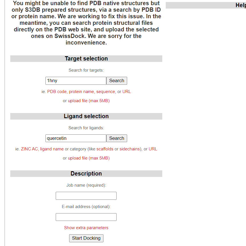- Enter receptor pdb Id in target box and then enter ligand name and search it in SwissDock.