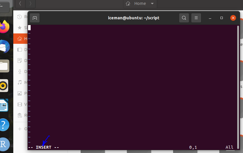 Now, press insert key on your keyboard. For your laptop, it seems the 0-key or ins is the insert key of your keyboard. After pressing it, insert mode will be activated in the create script in the linux terminal. Then, the insert mode will be activated on the terminal and you can see it in the end of your script as shown: