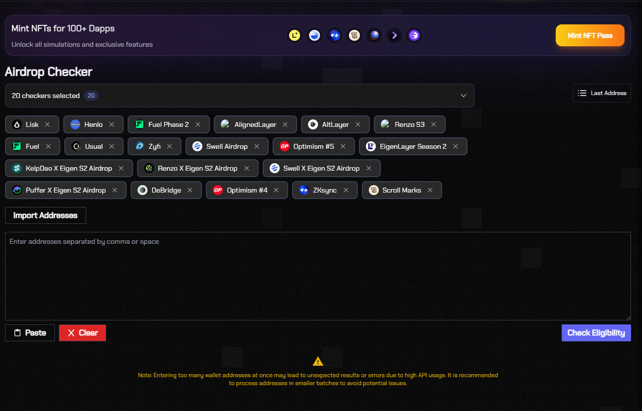 A comprehensive and organized interface for managing multiple wallets and tracking airdrop eligibility. Features: