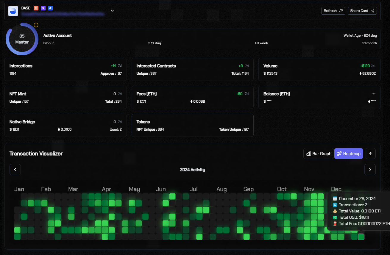 A comprehensive analysis page showing all details of your wallet. Provides detailed information about your assets, smart contract interactions, transaction volume, and activity days.